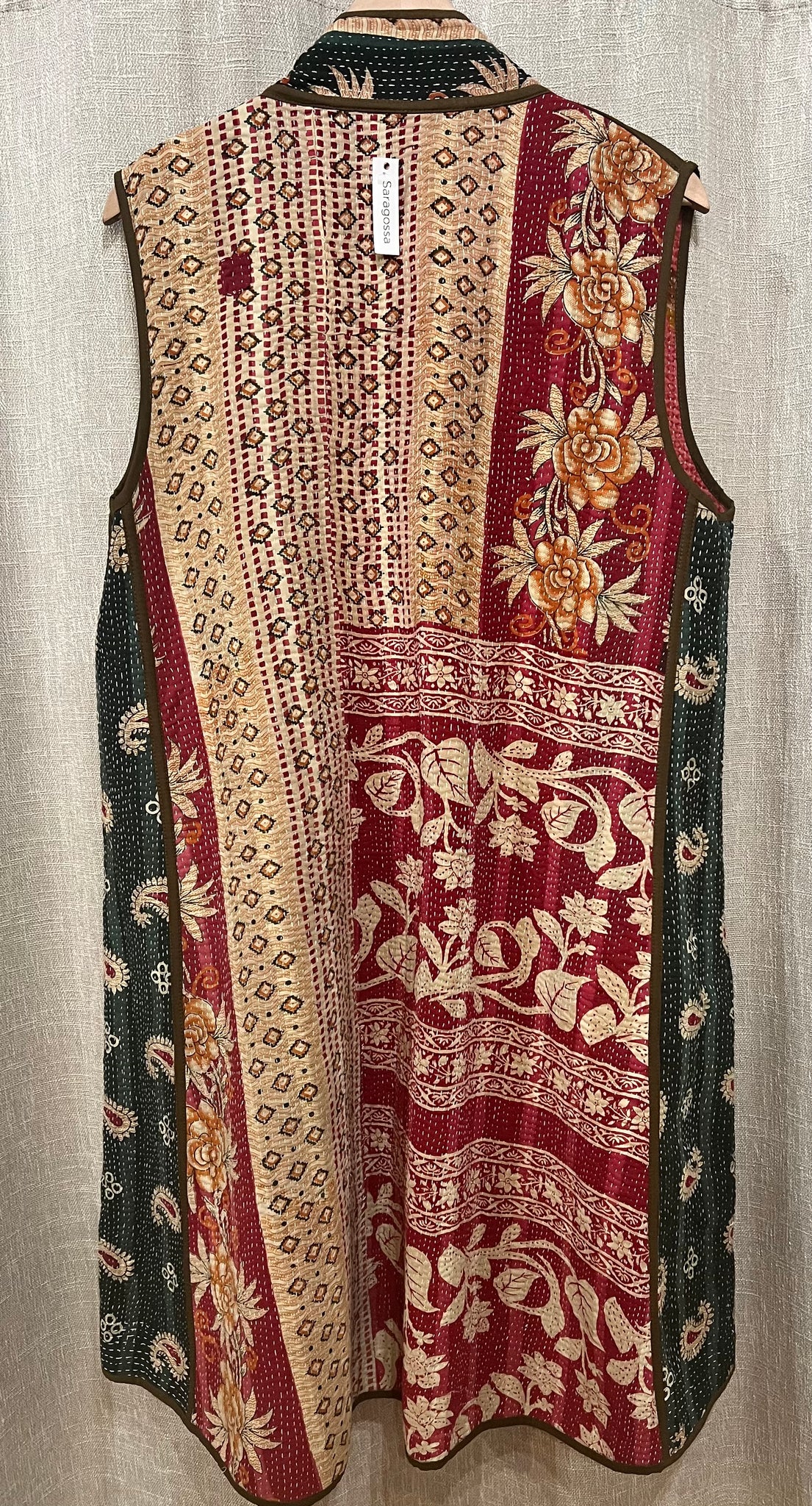 Each of Saragossa’s Milan vests is unique. The long cotton vest comes from the ancient kantha process. The technique involves simple, straight stitches that create a new dynamic on cotton fabrics. All the stitching is done by hand (using the ancient methods) so most of the stitches are uneven and in a few cases the stitch is broken. The artisans who sew the threads in the kantha fabric add colors and accents which deepen the beauty of the fabric. Saragossa’s Milan vest is full of different patterns with geometrical forms, drawings and floral expressions in a myriad of color. The Milan line is something you can use for every occasion. With different interpretations you can wear them at formal occasions or for something casual. Each vest is reversible so by turning the Milan inside out, you get an entirely different jacket. Milan Vests are One Size