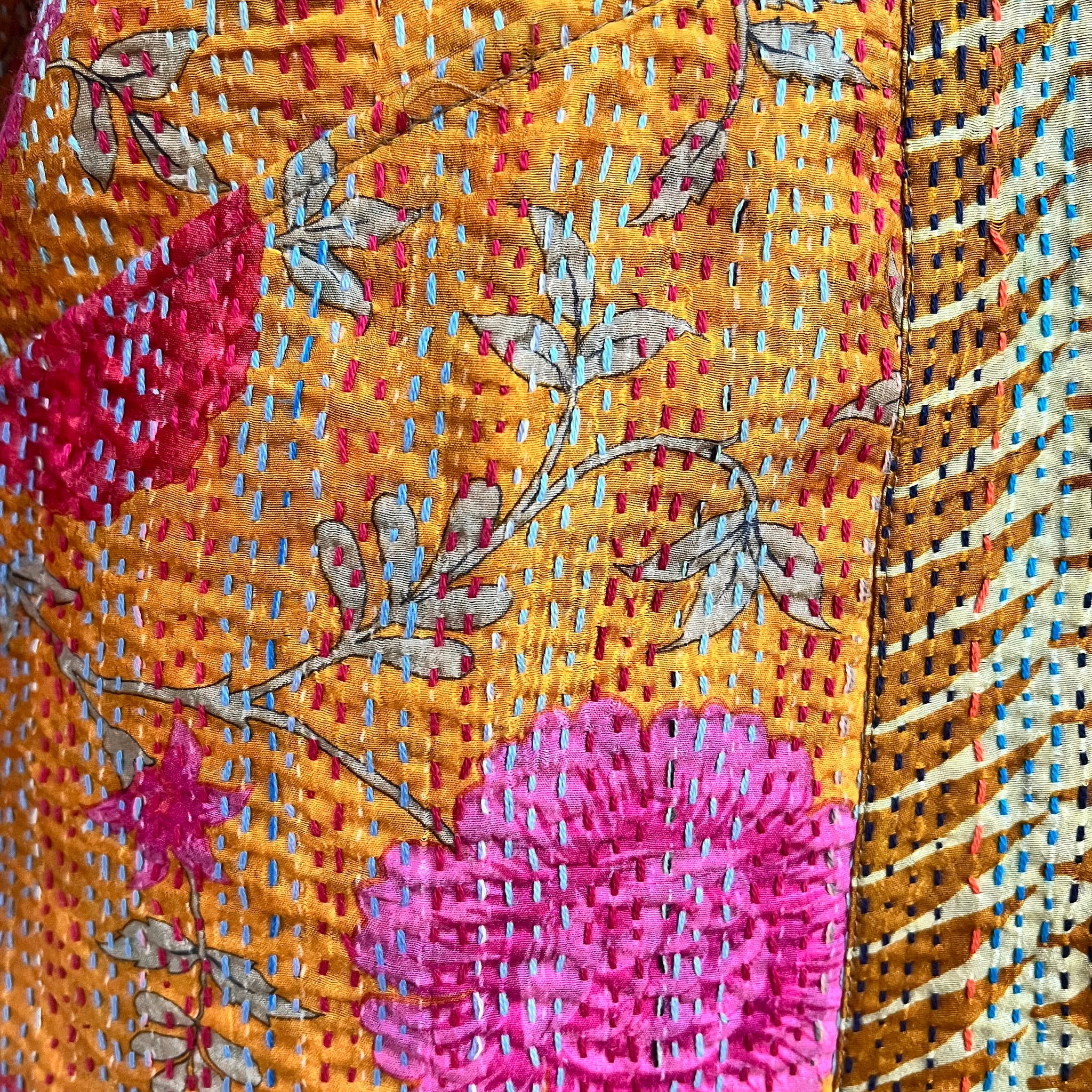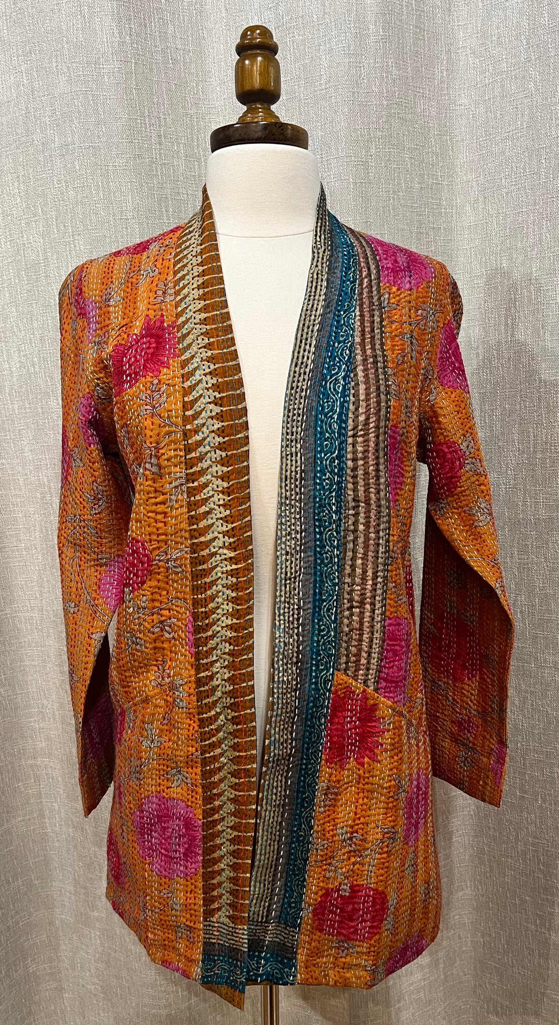 Saragossa is unique and colorful. We sell upcycled jackets in various styles. The fabric begins as recycled sarees from several Central Asian countries. The sarees are hand-stitched together to form kantha shawls. Then the shawls are used to create reversible jackets with an endless variety of colors and prints. And every jacket is just like Saragossa—entirely unique and colorful.
