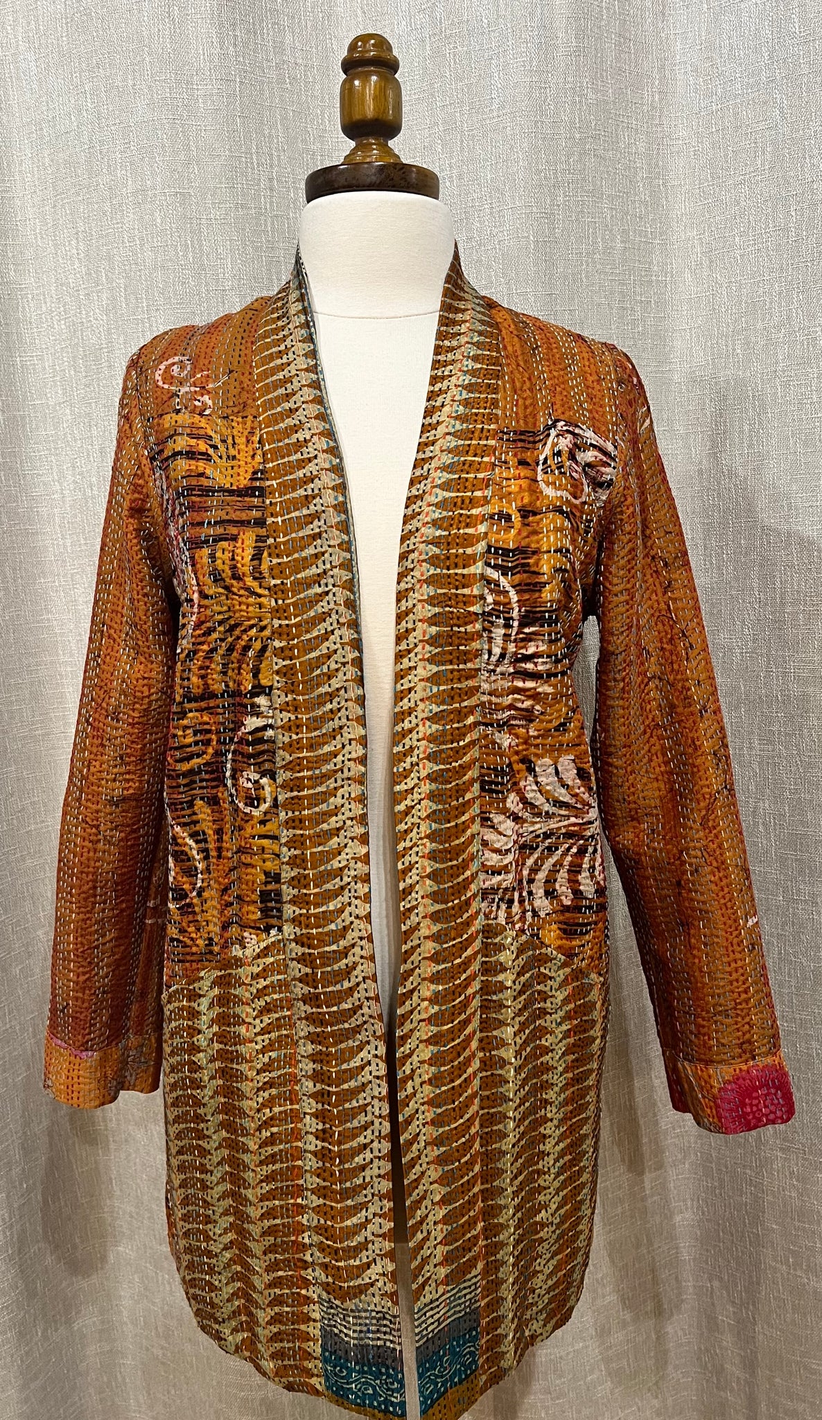 Saragossa’s Barcelona is a beautifully designed silk kantha jacket. Each jacket is unique and reversible. Kantha is a traditional form of embroidery that originated in the Indian subcontinent. The technique involves simple, running stitches that create beautiful patterns on the silk fabric. The versatility of the Barcelona jacket makes it perfect for business, formal occasions and nightlife. This reversible jacket features a wide tape of fabric at the lapel that complements the beautiful colors of every jacket. Barcelonas come in small, medium, large and extra large.