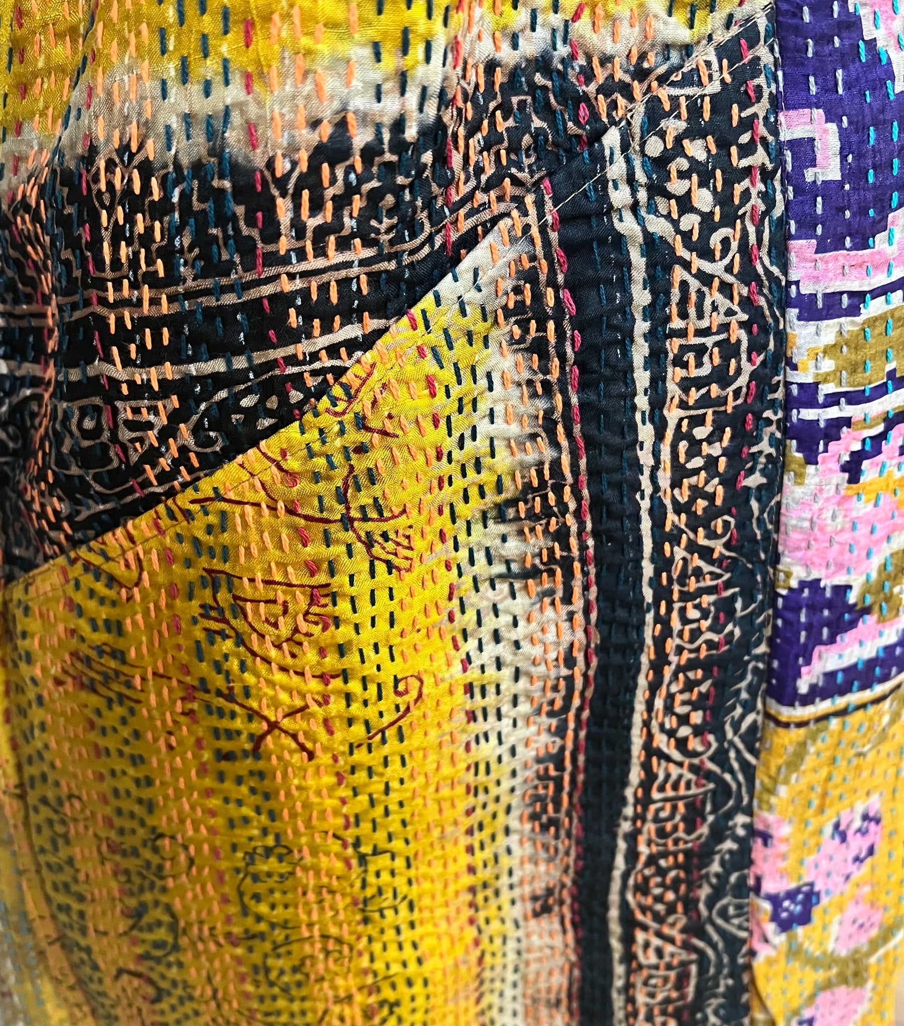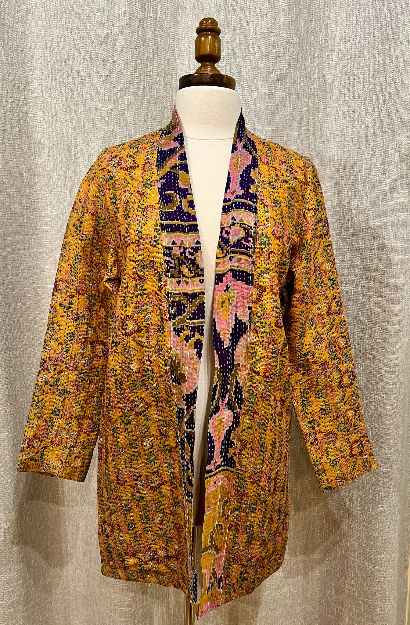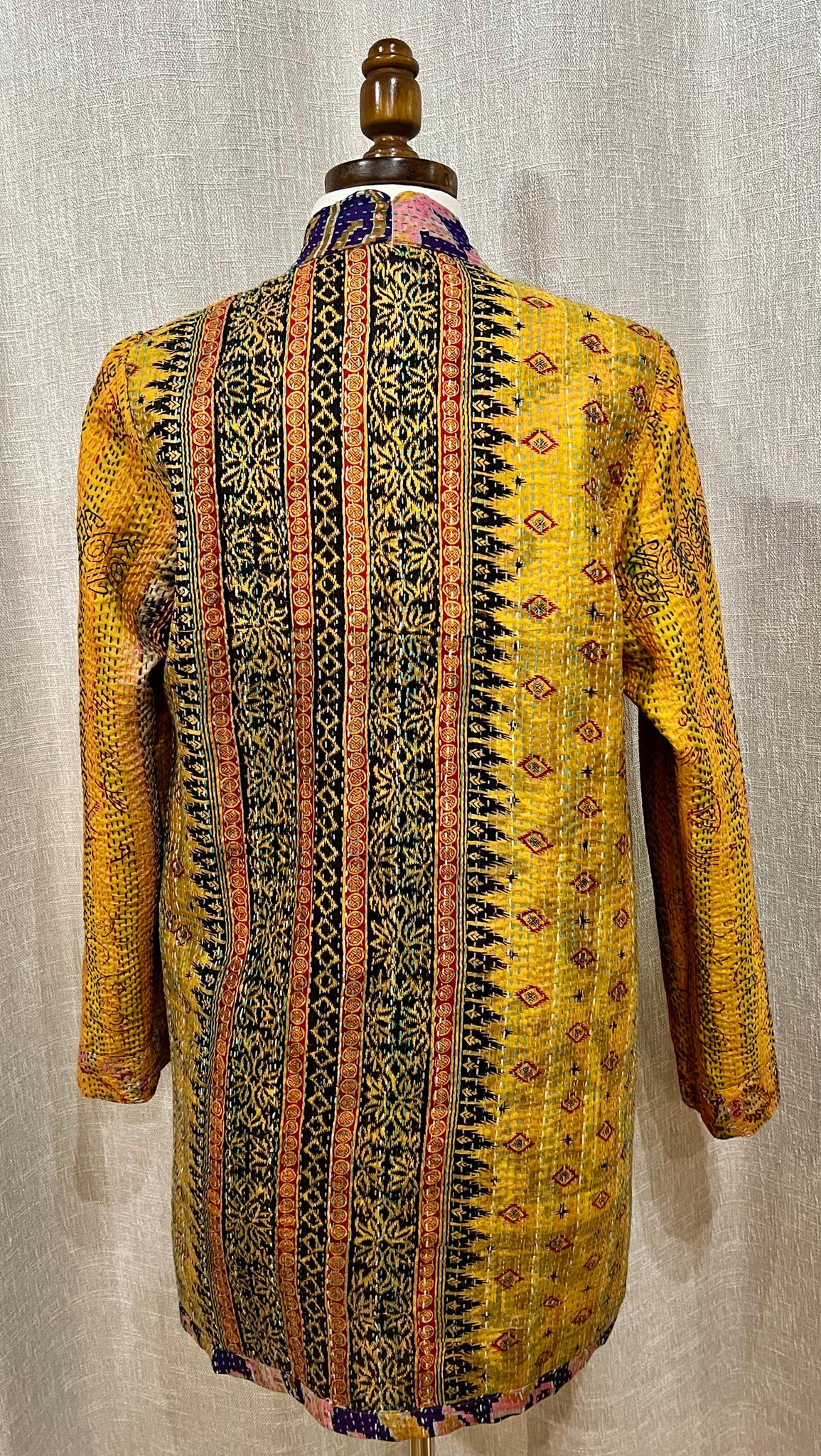 Saragossa’s Barcelona is a beautifully designed silk kantha jacket.  Each jacket is unique and reversible. Kantha is a traditional form of embroidery that originated in the Indian subcontinent. The technique involves simple, running stitches that create beautiful patterns on the silk fabric. The versatility of the Barcelona jacket makes it perfect for business, formal occasions and nightlife. This reversible jacket features a wide tape of fabric at the lapel that complements the beautiful colors of every jacket.   Barcelonas come in small, medium, large and extra large.