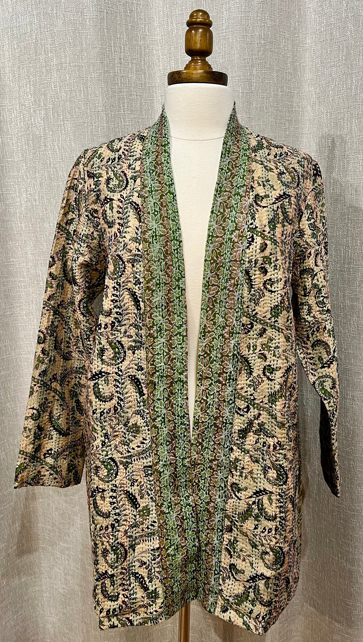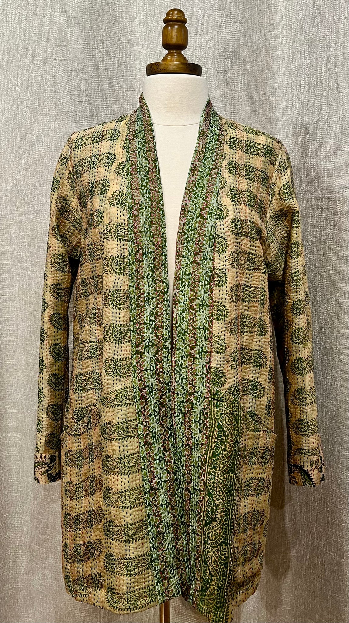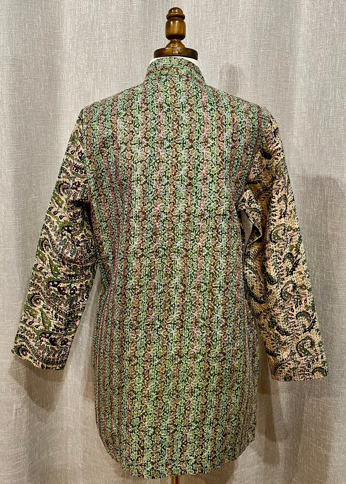 Saragossa’s Barcelona is a beautifully designed silk kantha jacket. Each jacket is unique and reversible. Kantha is a traditional form of embroidery that originated in the Indian subcontinent. The technique involves simple, running stitches that create beautiful patterns on the silk fabric. The versatility of the Barcelona jacket makes it perfect for business, formal occasions and nightlife. This reversible jacket features a wide tape of fabric at the lapel that complements the beautiful colors of every jacket. Barcelonas come in small, medium, large and extra large.