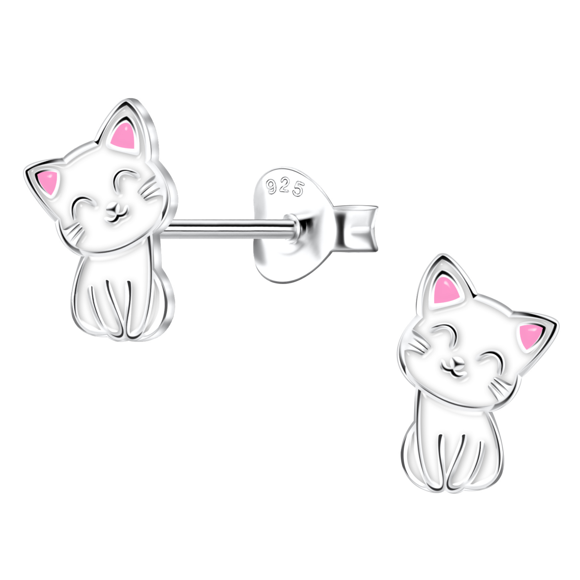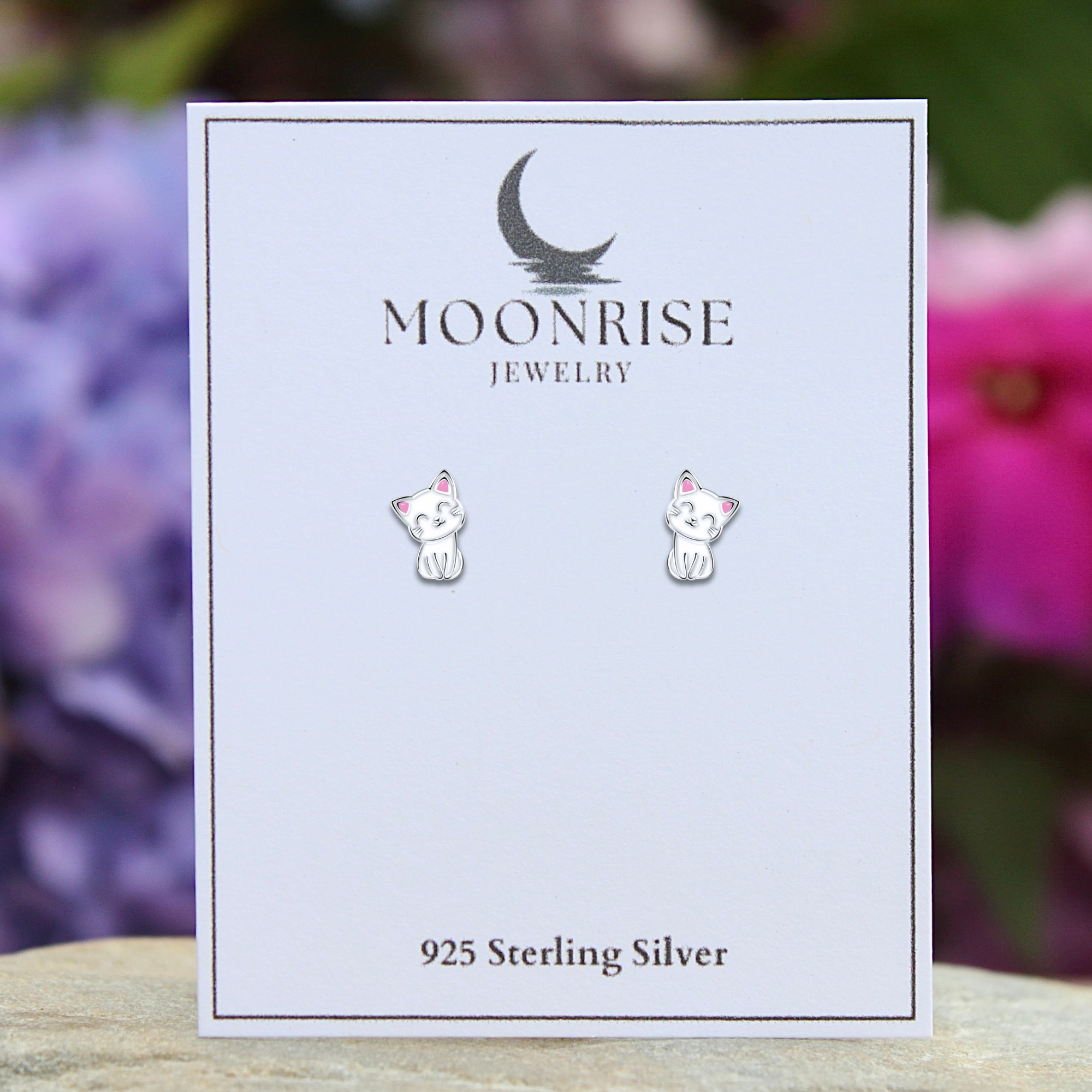 Crafted from high-quality 925 sterling silver, our Smiling Cat Earrings feature a charming white kitten design with a durable E-coat enamel finish that enhances both color and longevity. These hypoallergenic studs are nickel and lead-free, making them ideal for sensitive skin. Measuring a delicate 6 x 9mm, they offer a subtle yet playful accent suitable for everyday wear or special occasions.