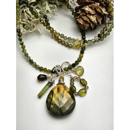Gorgeous necklace featuring a 22mm Golden Labradorite briolette floater flanked by a Grossular Garnet briolette, a ring of Smoky Quartz and oval Green Tourmaline, a Smoky Quartz teardrop, and a Green Tourmaline “branch” floater. All drops are attached to 7mm sterling silver rings that float along a 32" strand of shaded Green Tourmaline rondels. Finished with an oval lobster clasp and 3" extender chain, creating 35" of necklace to enjoy.