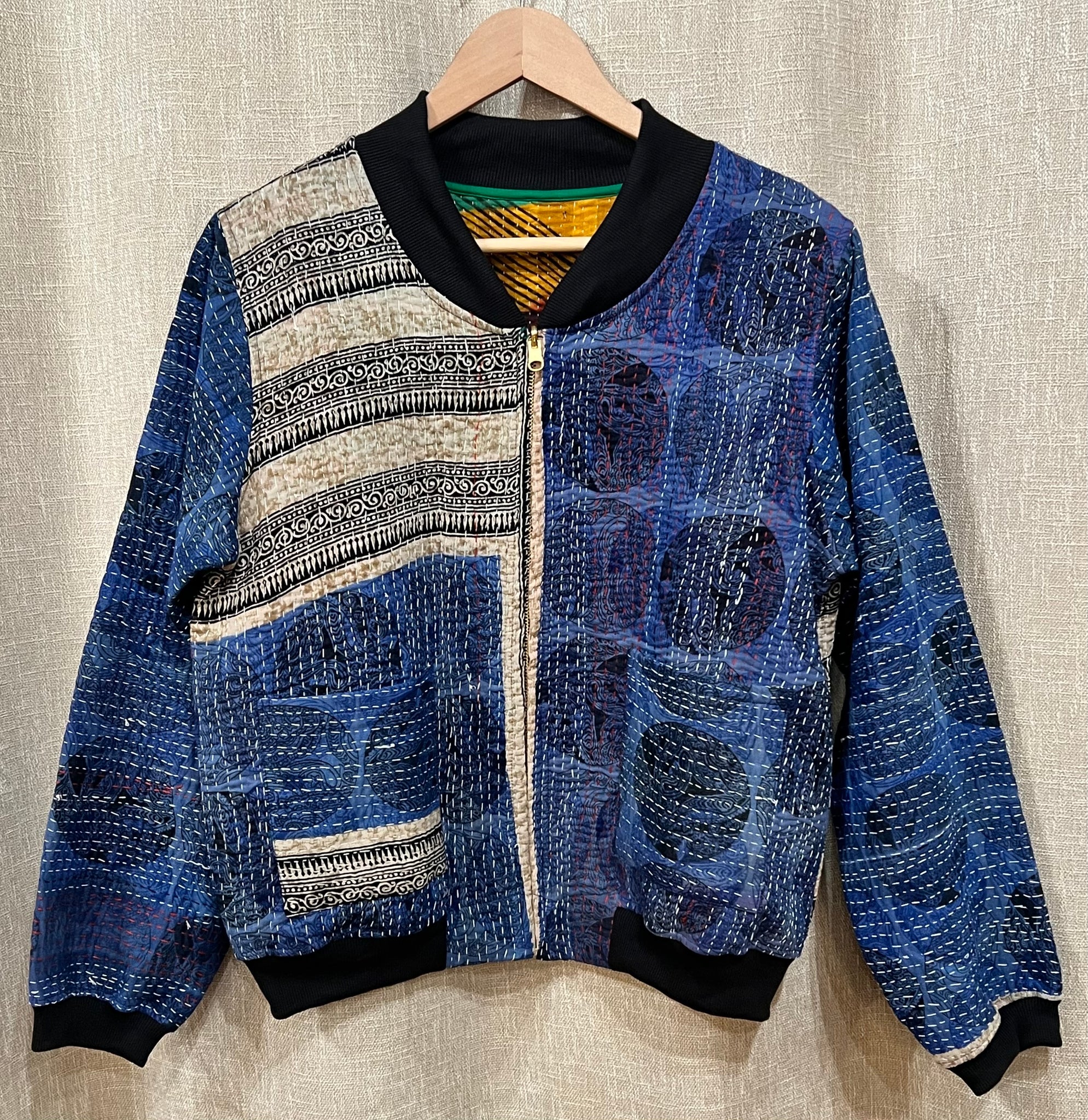 Sustainable by design: repurposed saris → quilts → this bomber jacket